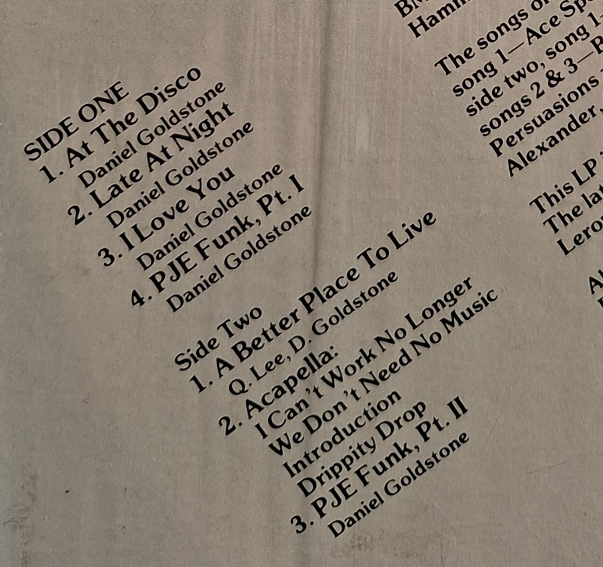 AT THE DISCO ( incl. title track, later at night, pje funk, a better place to live, etc. )